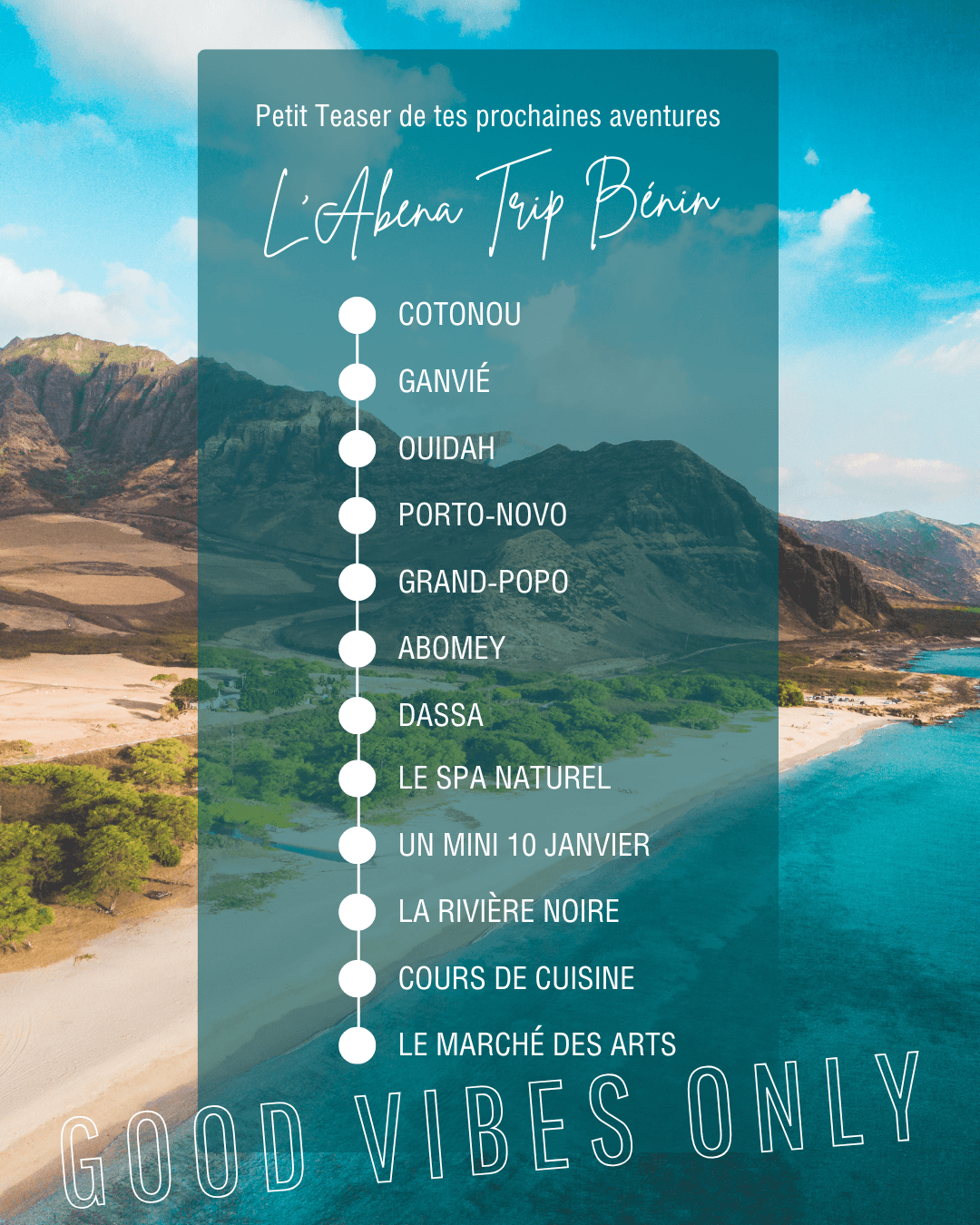 À travers L'ABENA TRIP, elle vous ouvre les portes d’un voyage unique, pensé avec amour et authenticité. Son objectif ? Vous faire découvrir le Bénin comme personne ne vous l’a jamais raconté, avec des rencontres inoubliables, des moments forts et une immersion totale dans l’âme du pays.
